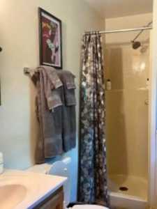 NO LOFT BATHROOM: The queen bedroom has it’s own en suite bathroom (the bathroom with the laundry machine) and the other bathroom is across from the kitchen and is for the remaining occupants to use. Both bathrooms are on the main floor, so anyone sleeping in the loft will need to come downstairs to use the bathroom.